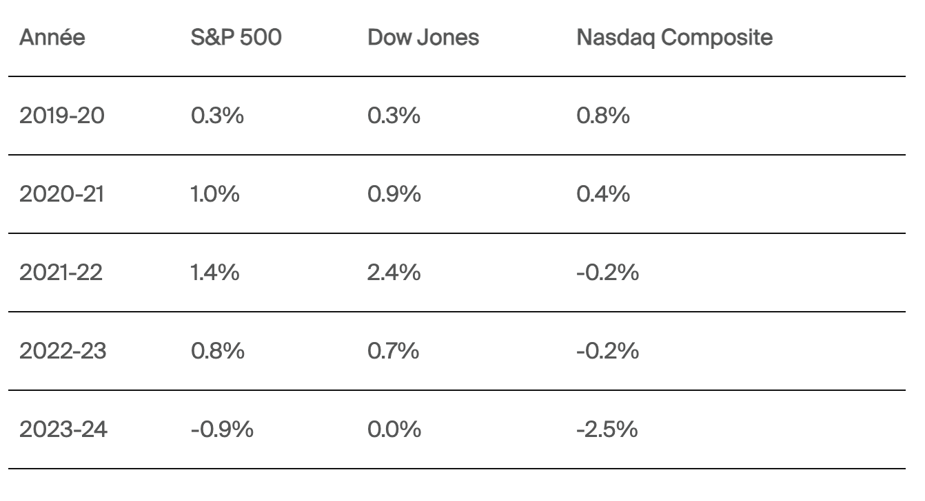 - Le S&P 500 a affiché une performance moyenne de +1,3 % sur la période depuis 1950.